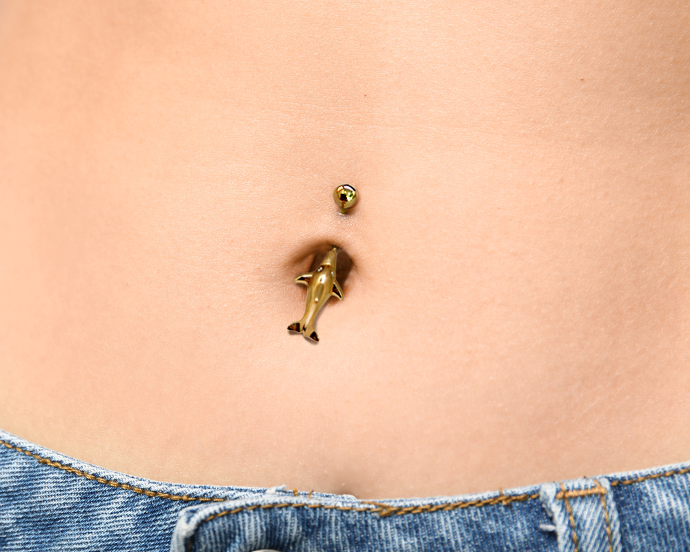 14K Gold Belly Ring - Dolphin Belly Bar, 14G Belly Button Piercing, Navel Jewellery -Hand Made Gold Body Jewellery Rings