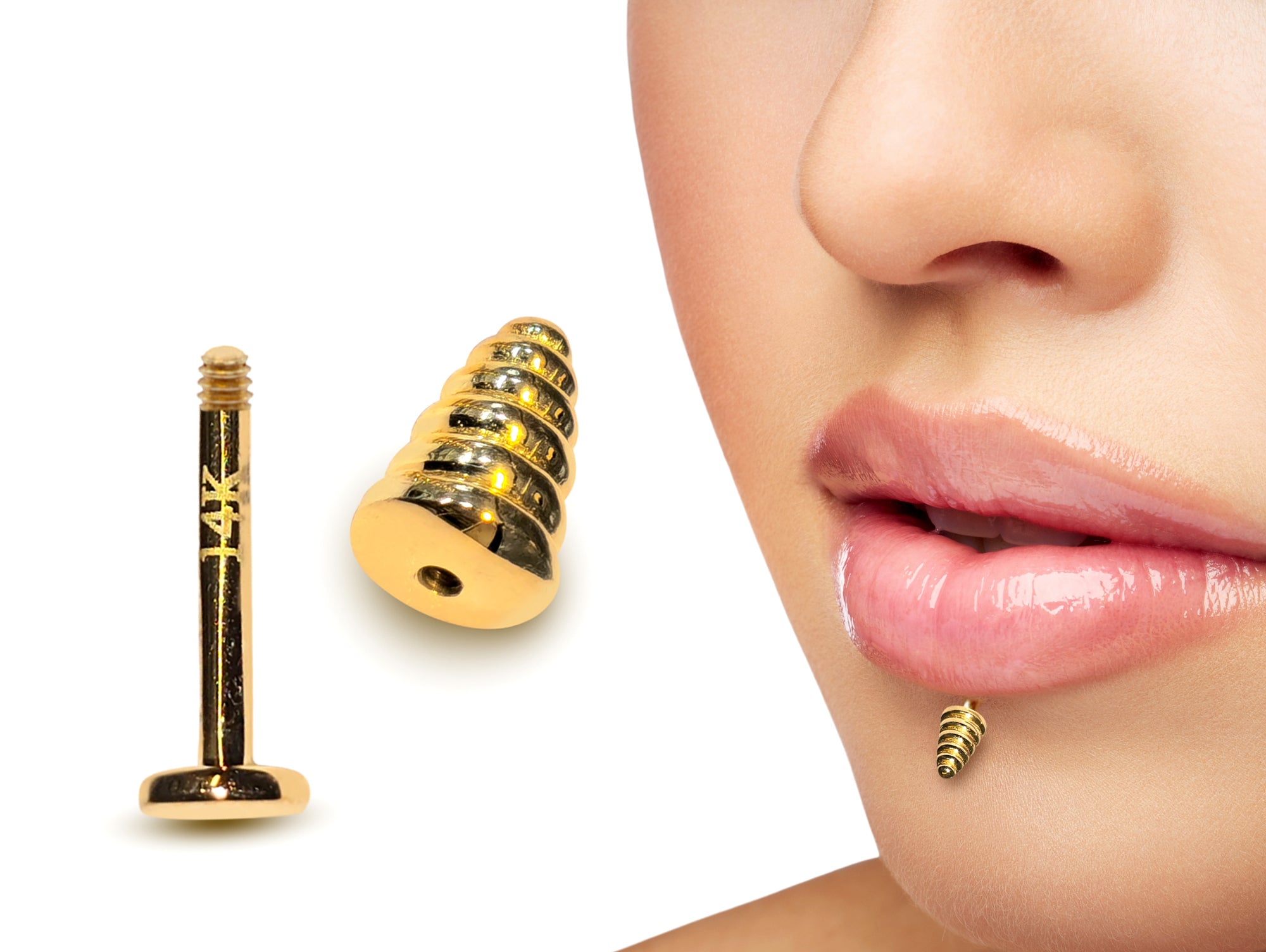 14K Gold Pyramid Cone Labret Stud Lip Jewellery, Lip Piercing Tragus Earring - 14G Body Jewellery Gold Lip Bar
