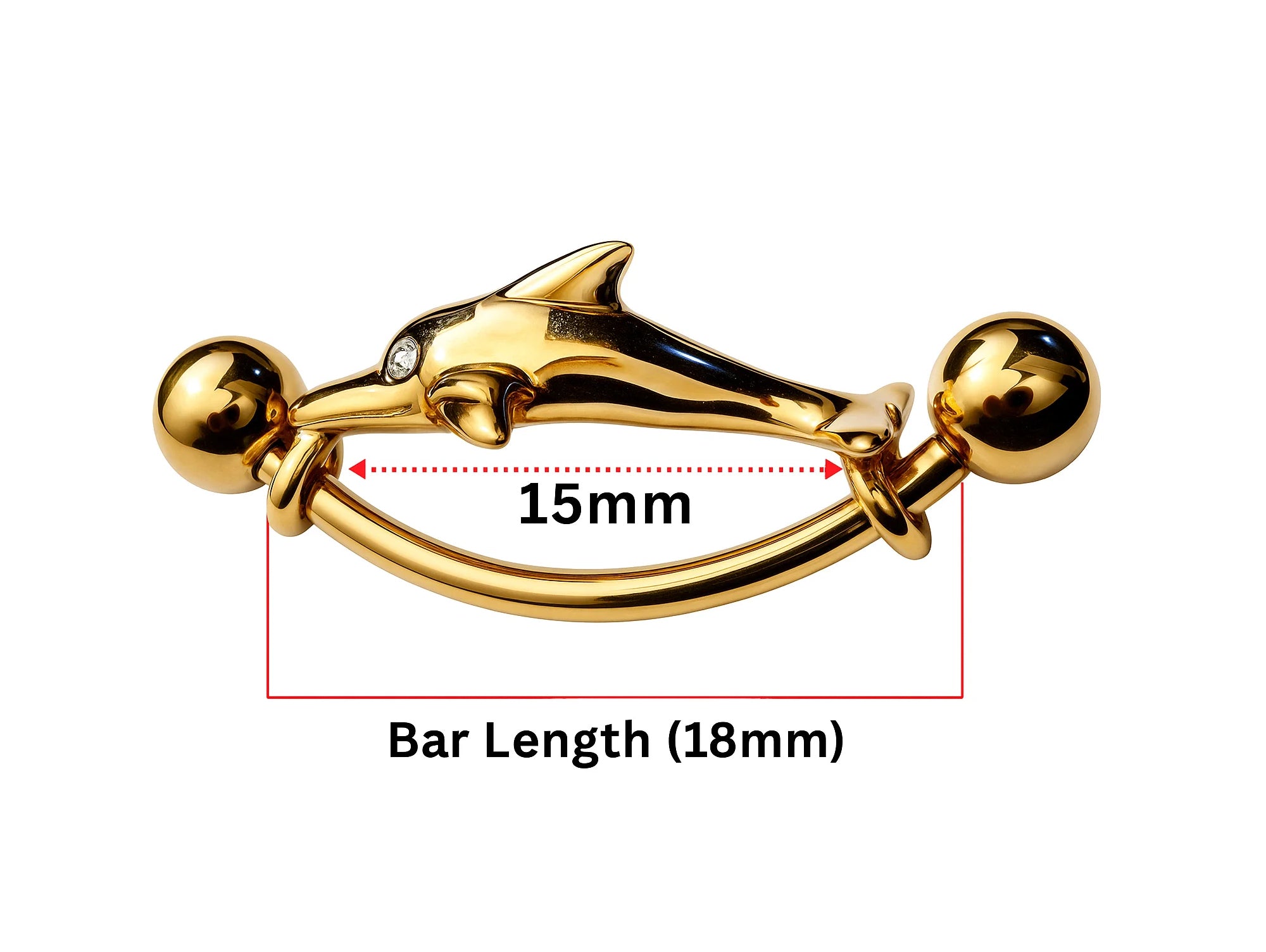14K Gold Belly Bar Solid Gold Dolphin Navel Ring - 14g Piercing Length is 16mm - Finest Quality Gold Body Piercing Jewelry