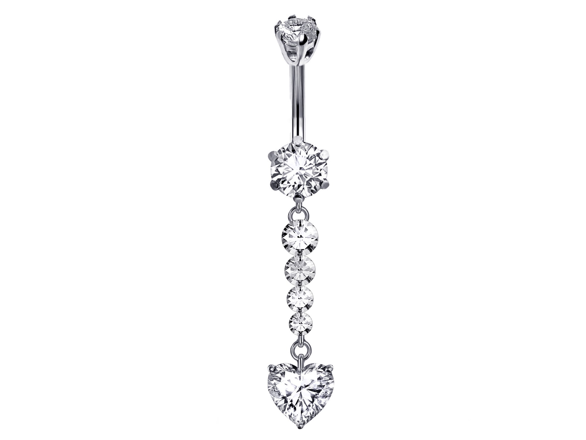 Designer Belly Bars - Silver - Dangle Cute Heart Belly Ring made of CZ Crystals - Navel Ring - 14g (1.6mm) Length is 10mm
