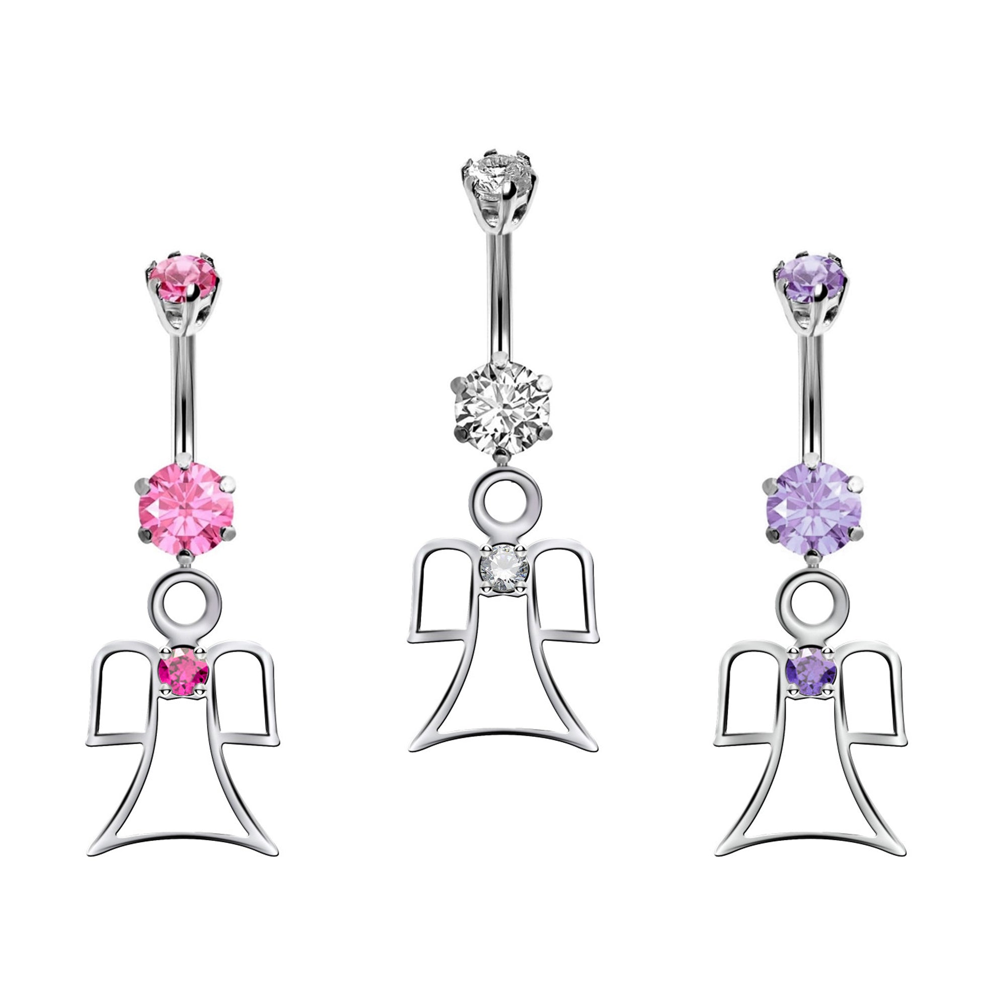 Designer Belly Bars - Silver - Guardian Angel Design Belly Ring with Center CZ Crystals - Navel Ring - 14g (1.6mm) Length is 10mm