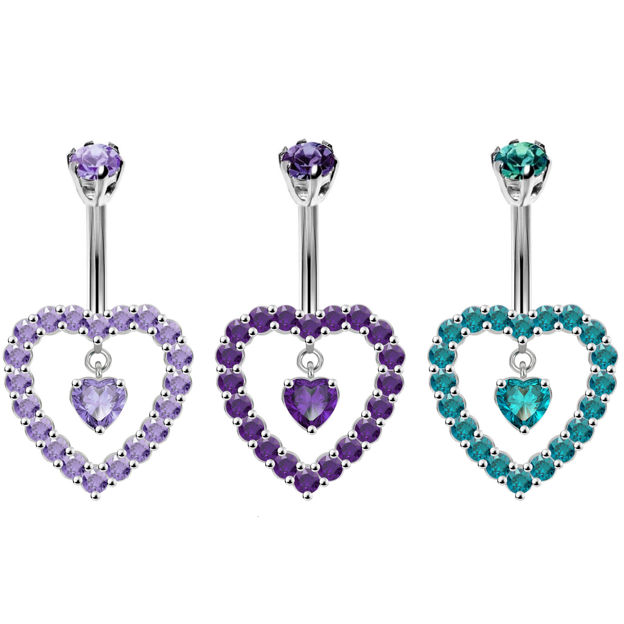 Designer Belly Button Ring - Silver - Heart hole with Heart Dangle Belly Ring made of CZ Crystals - Belly Button - 14g (1.6mm)