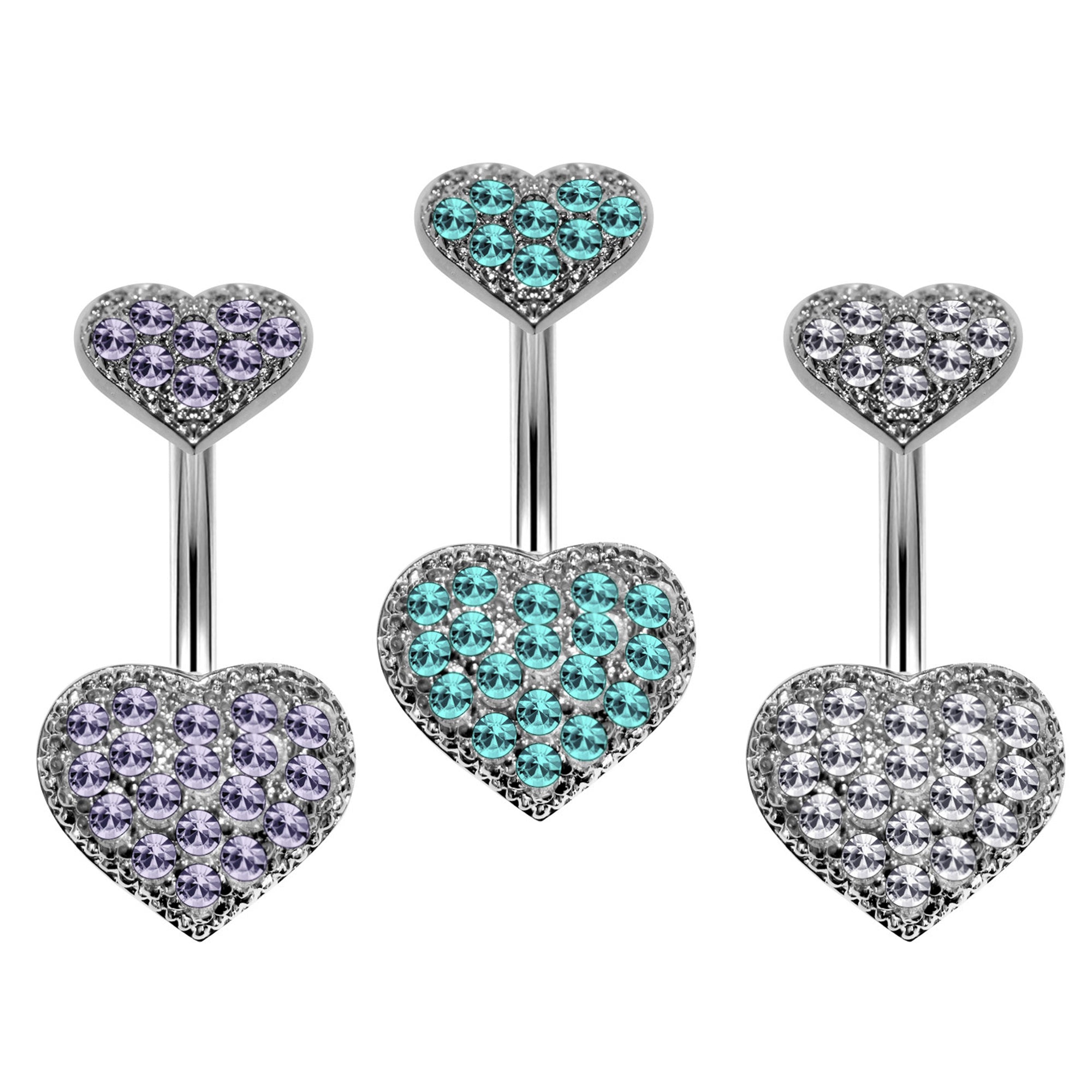 Designer Belly Ring - Silver - Double Heart Top and Bottom Belly Ring studded with CZ Crystals - Navel Ring - 14g (1.6mm) Length is 10mm
