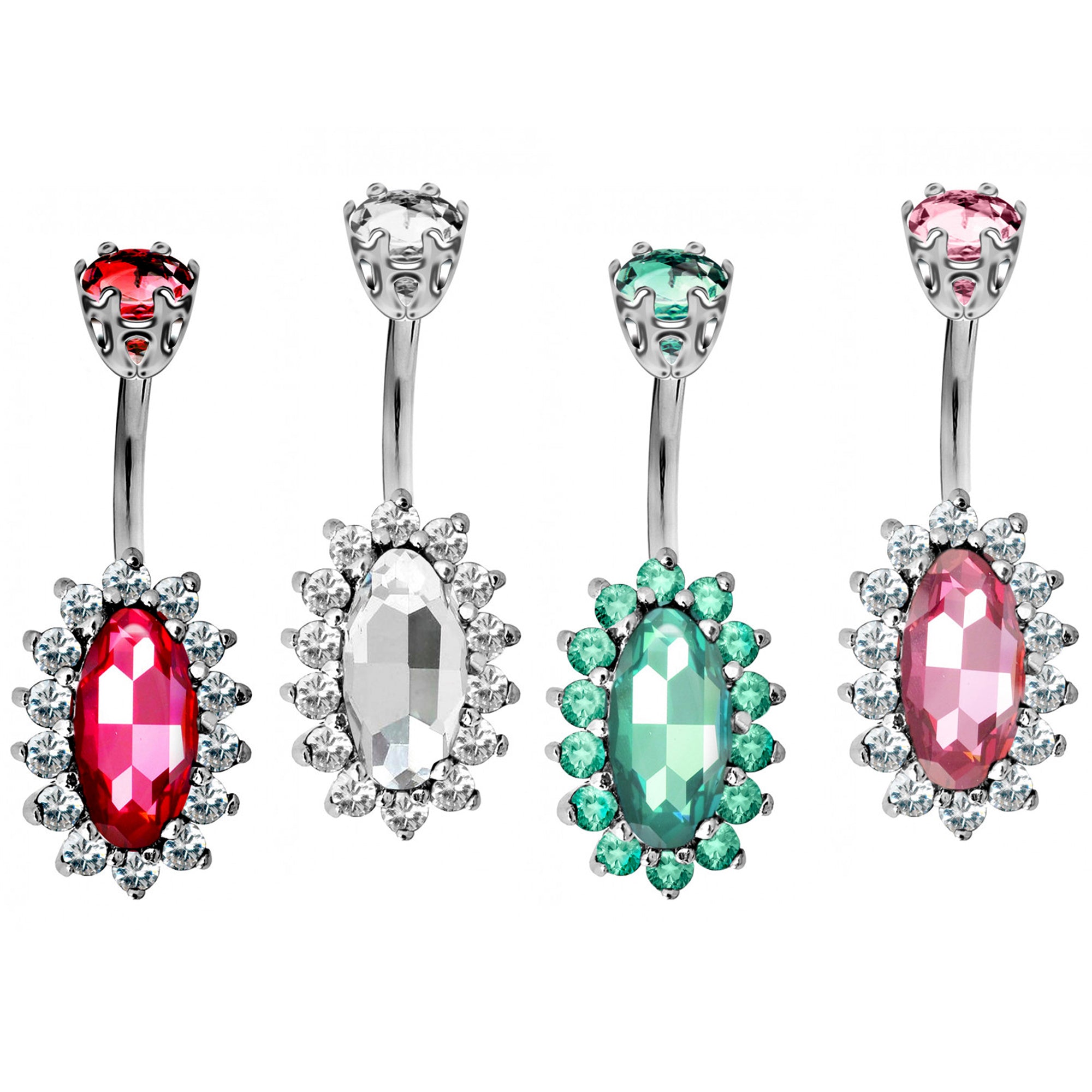 Designer Belly Ring - Silver - Oval Shape Flower Belly Bars with CZ Crystals - Navel Ring - 14g (1.6mm) Length is 10mm