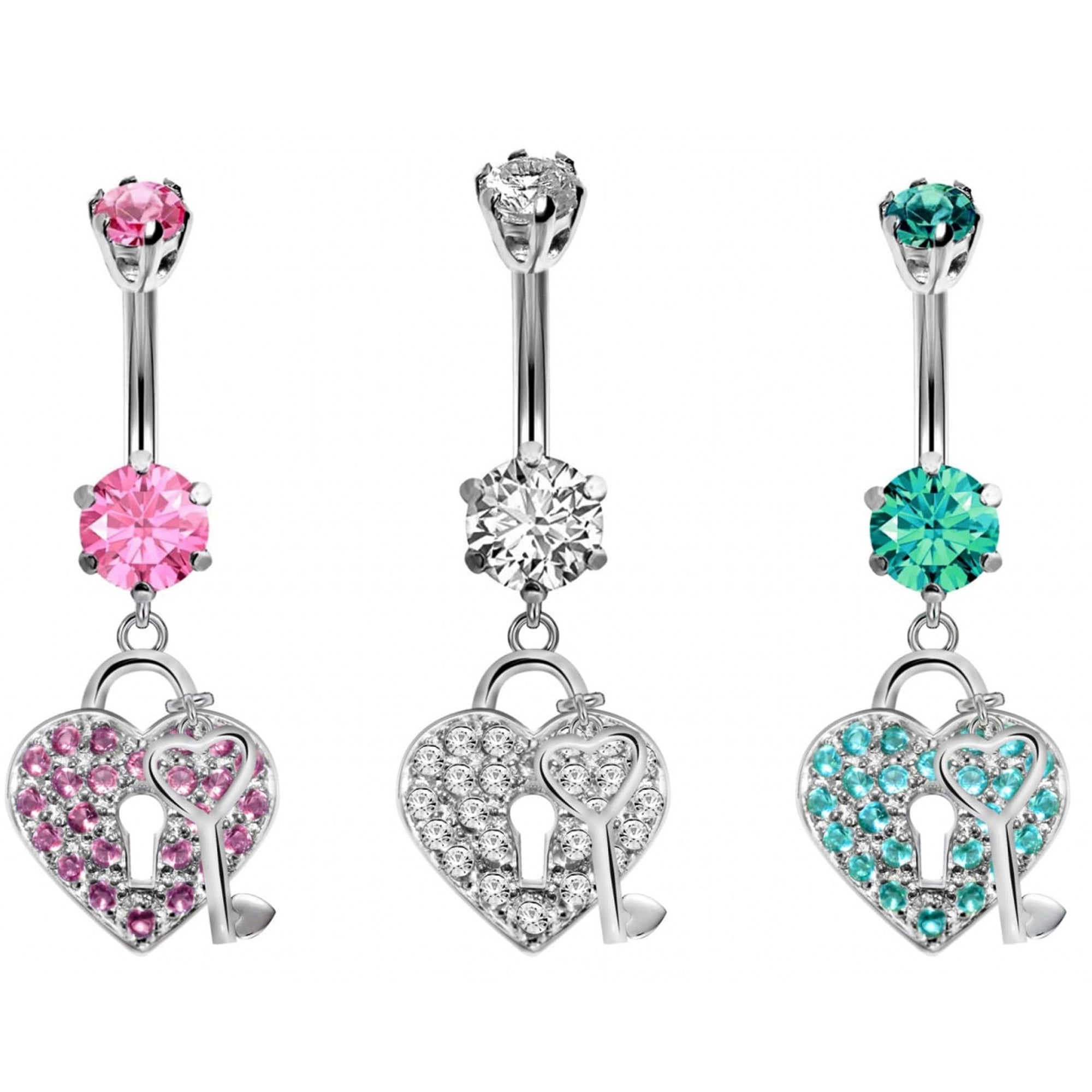 Designer Belly Rings - Silver - Dangle Heart and Key Lock Design Belly Bars surrounded with CZ Crystals - Navel Jewelry - 14g (1.6mm)