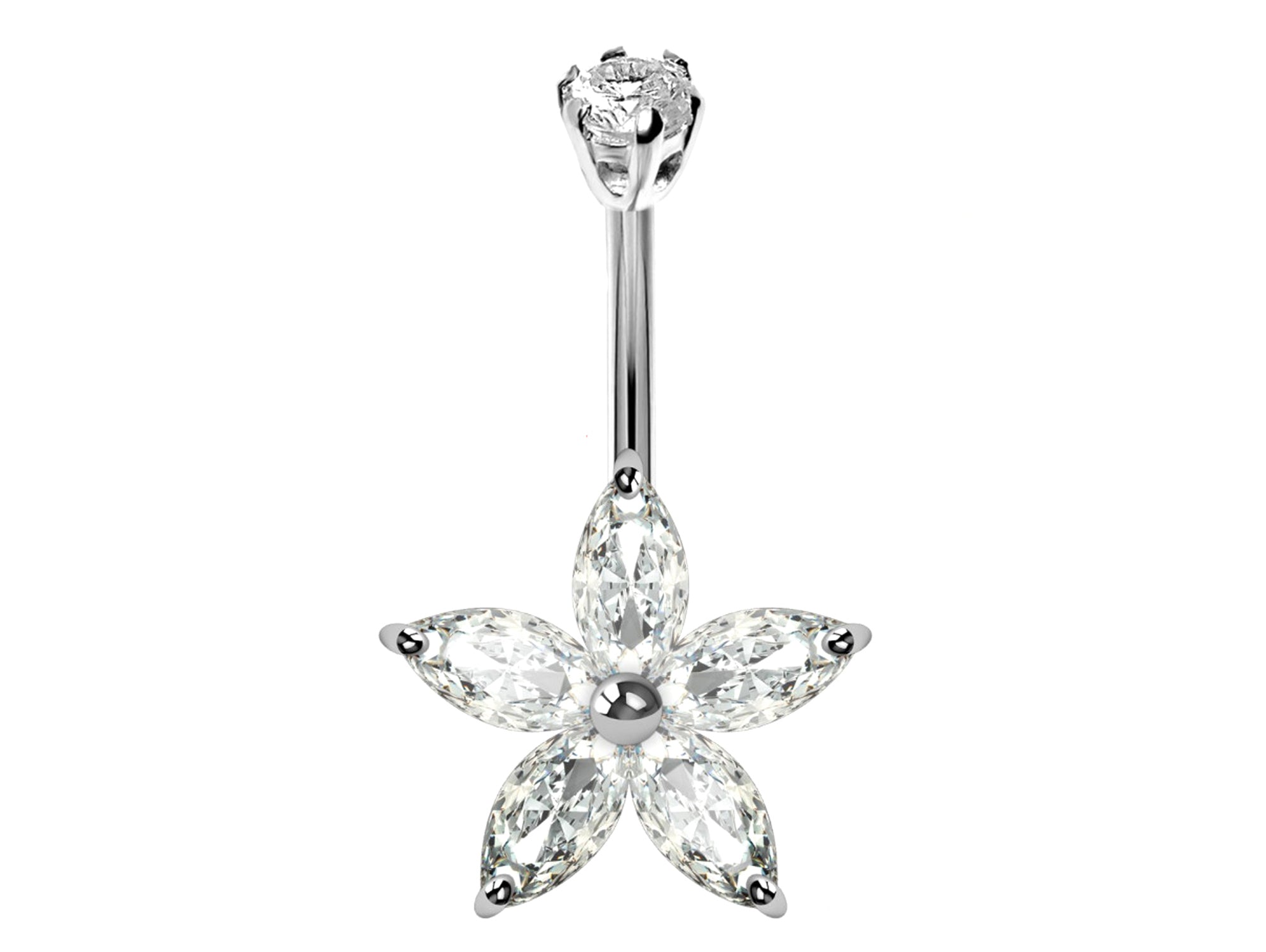 Designer Belly Rings - Silver - Hawaiian Flower Belly Bars with CZ Crystals - Belly Button Ring - 14g (1.6mm) Length is 8mm