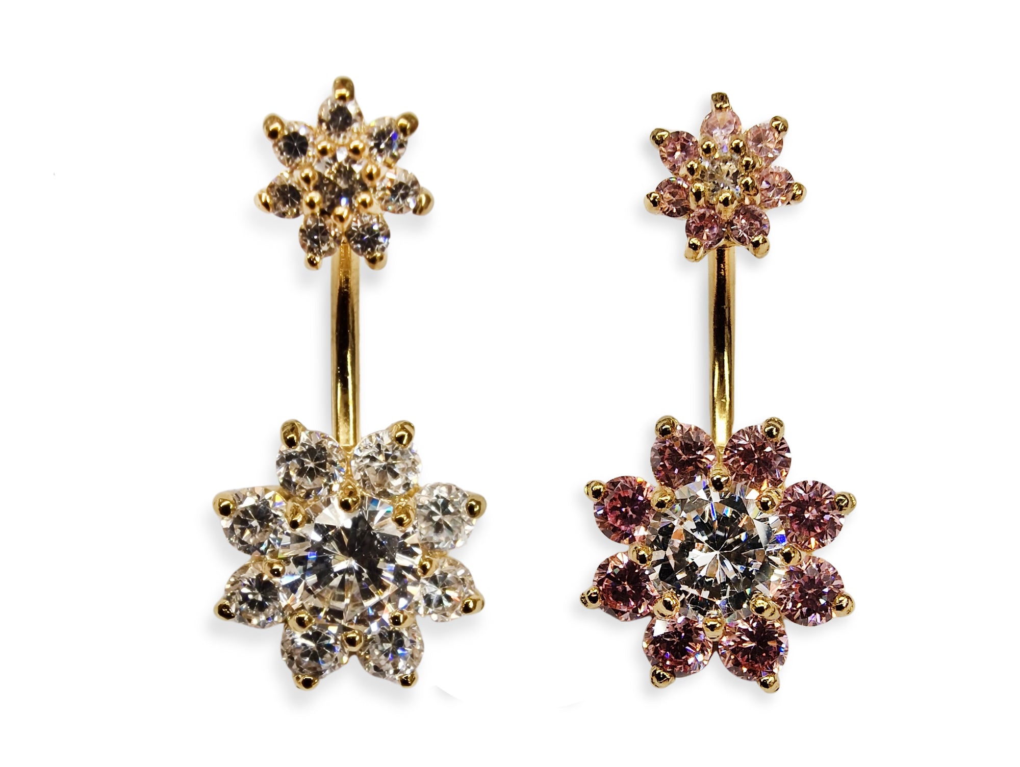 Double Flower Belly Button Ring, Silver Belly Bar with CZ Crystals - Gold Plating - 14G Length is 10mm