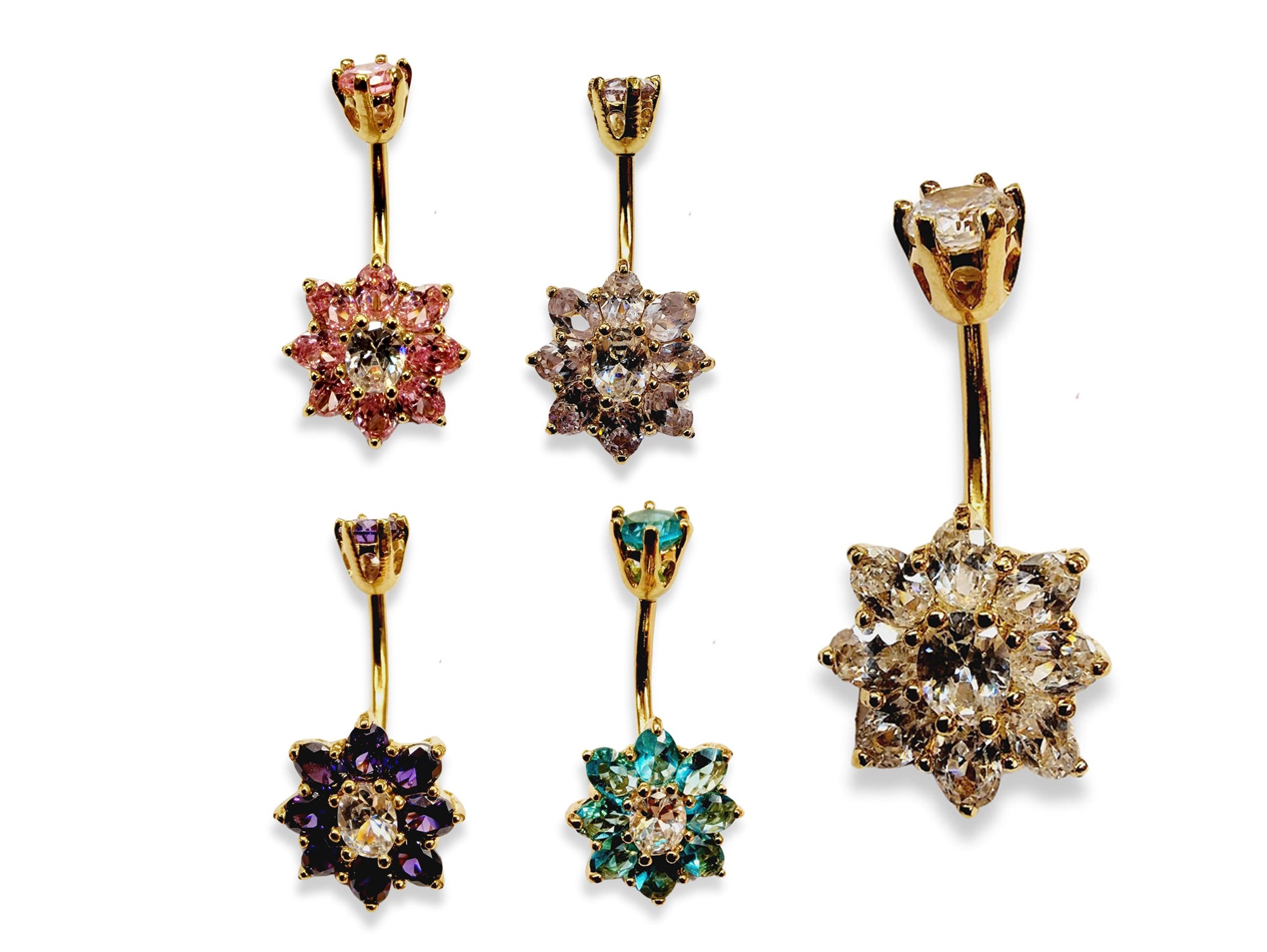 Flower Belly Ring, Navel Ring - Silver Gold Plated Belly Bar Crystal Body Jewellery - 14G - Length is 10mm