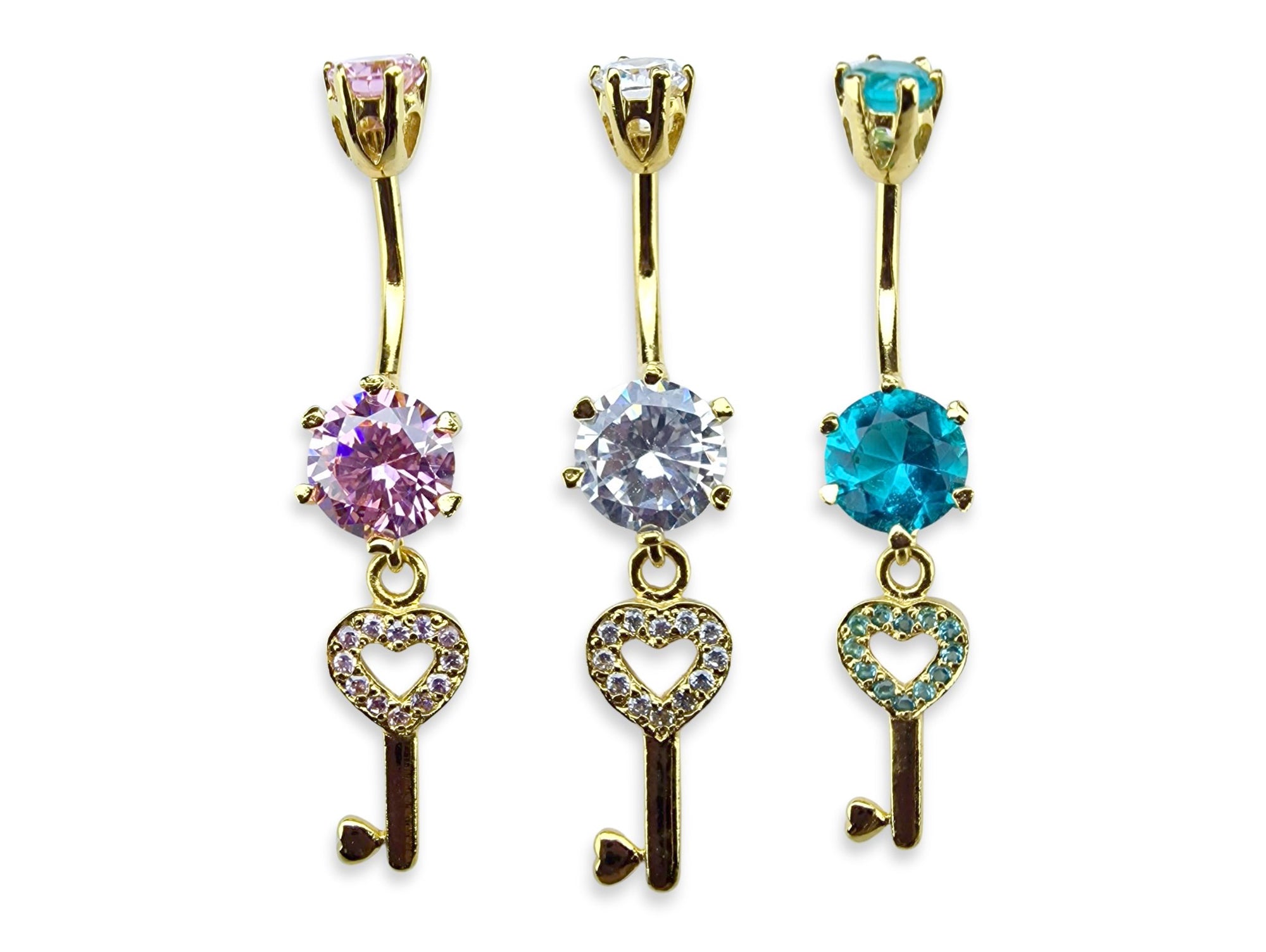 Gold Plated Round Belly Bar with Dangle Key with CZ Crystals - Silver Belly Ring 14G length is 10mm