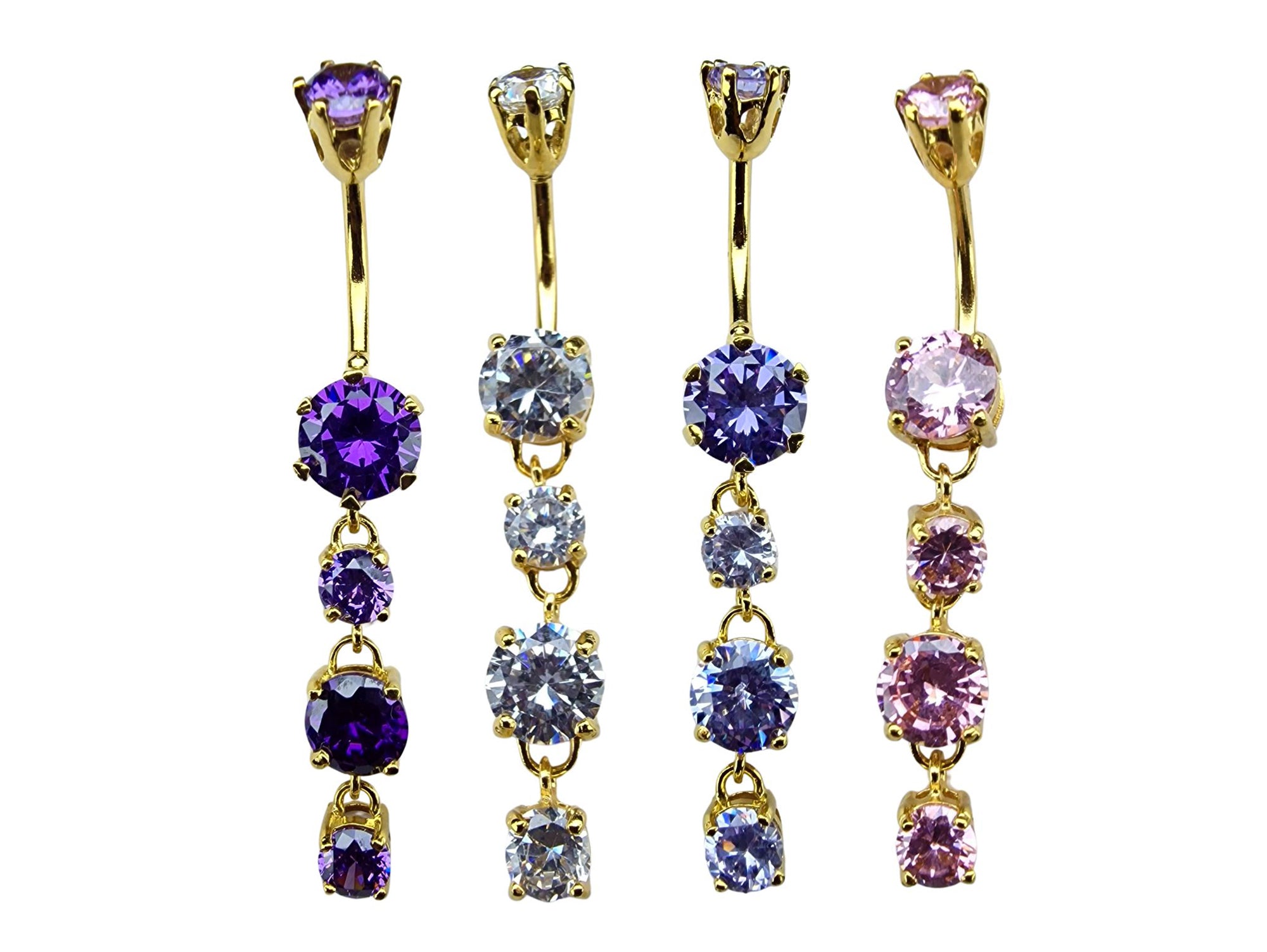 Gold Plated Round Dangle Belly Ring with CZ Crystals - Silver Belly Bars 14G length is 10mm