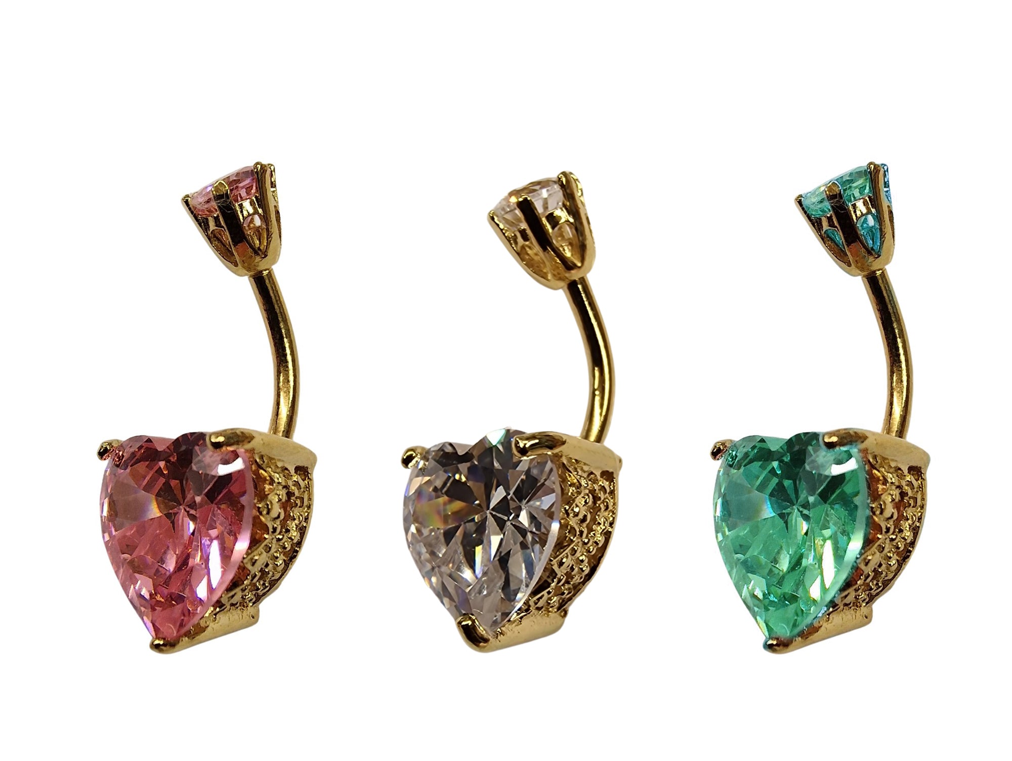 Heart Belly Bar Crystal , Silver Gold Plated Navel Ring with Side Designs - 14G Length is 10mm