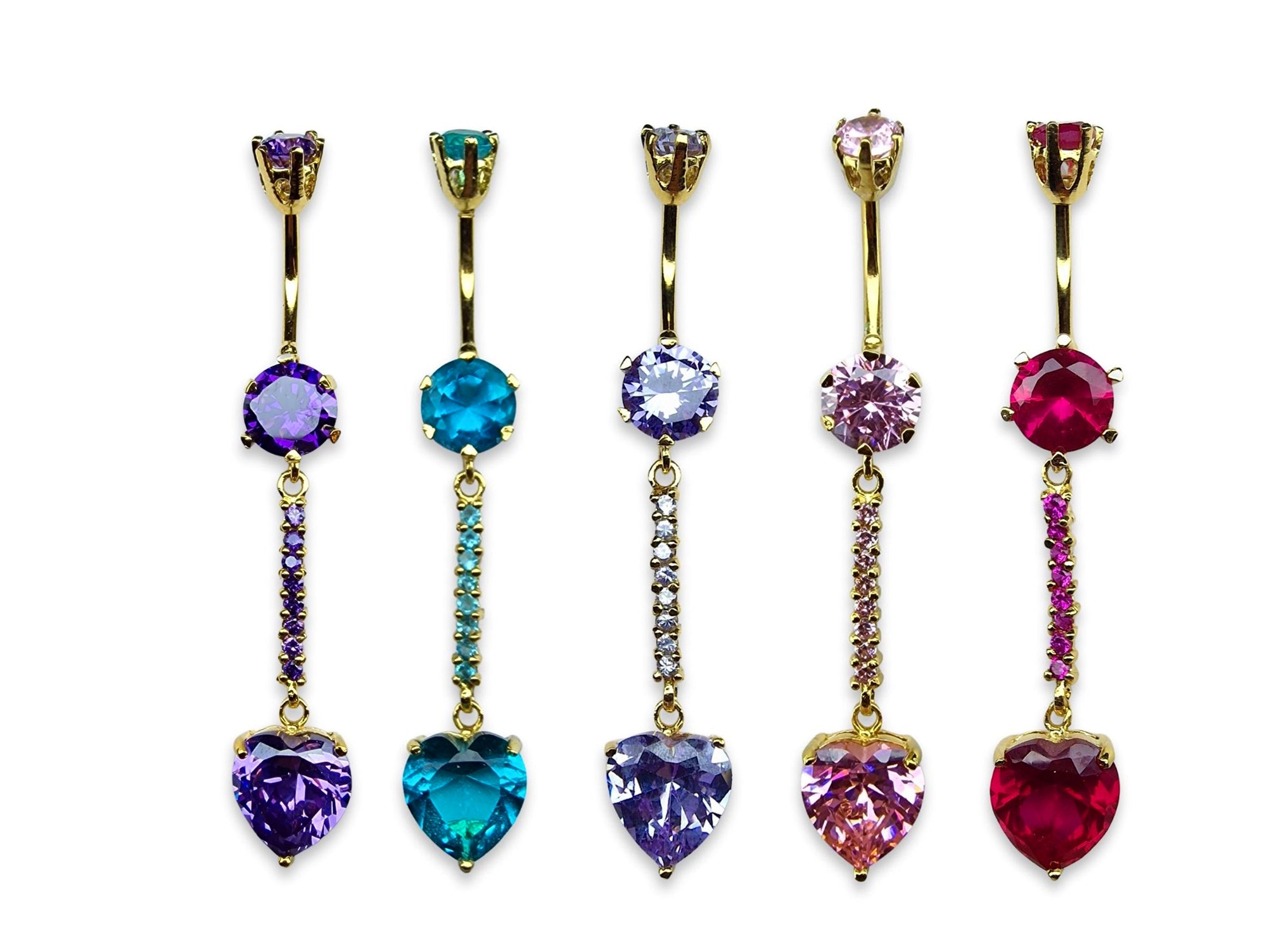 Long Belly Button Ring, Dangle Heart Belly Bar with Crystal Hand Set - Gold Plated Silver Belly Piercing - 14G length is 10mm