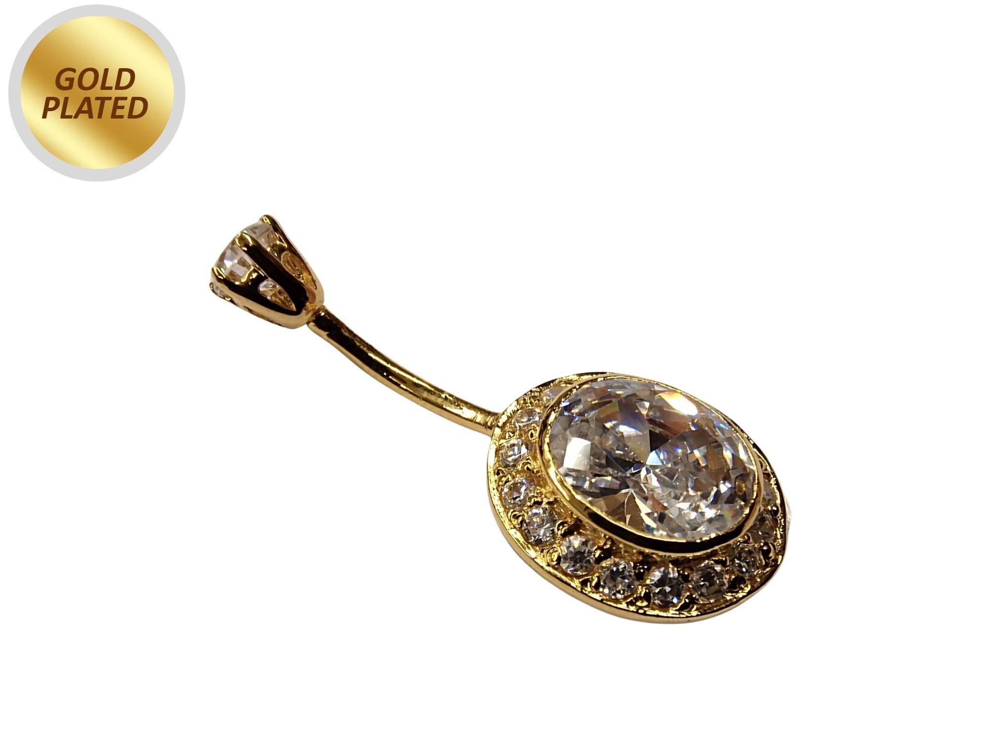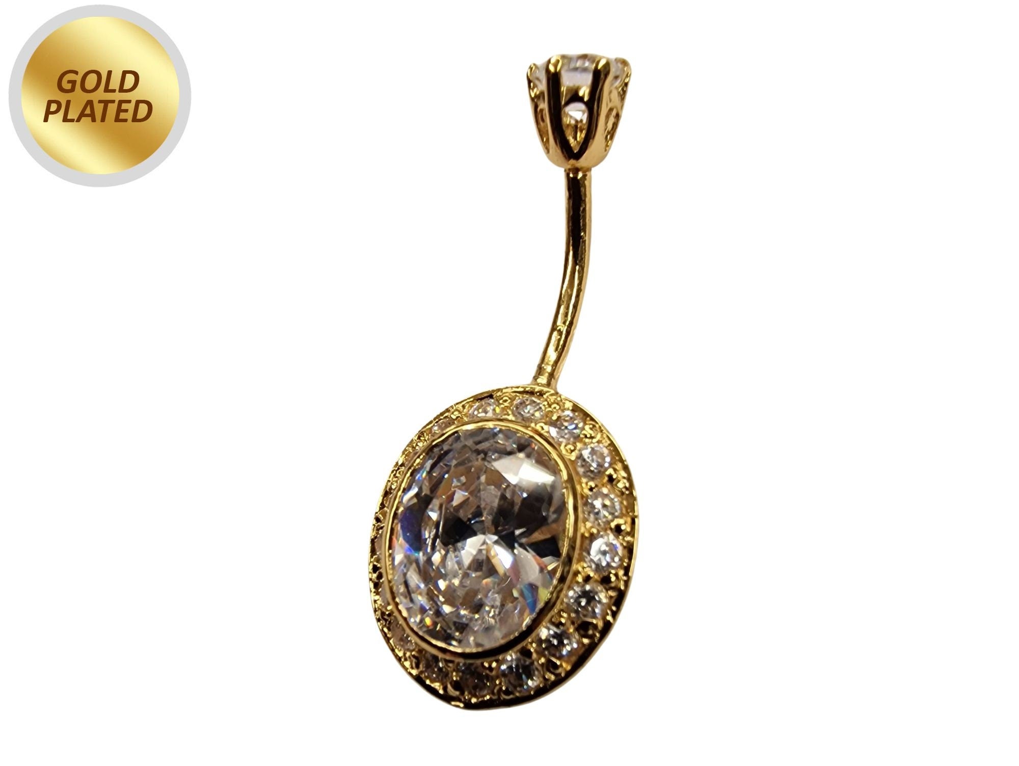 Oval Shape Silver Belly Button Ring, Crystal Belly Piercing Curved Barbell in Gold Plating - 14G Length is 10mm
