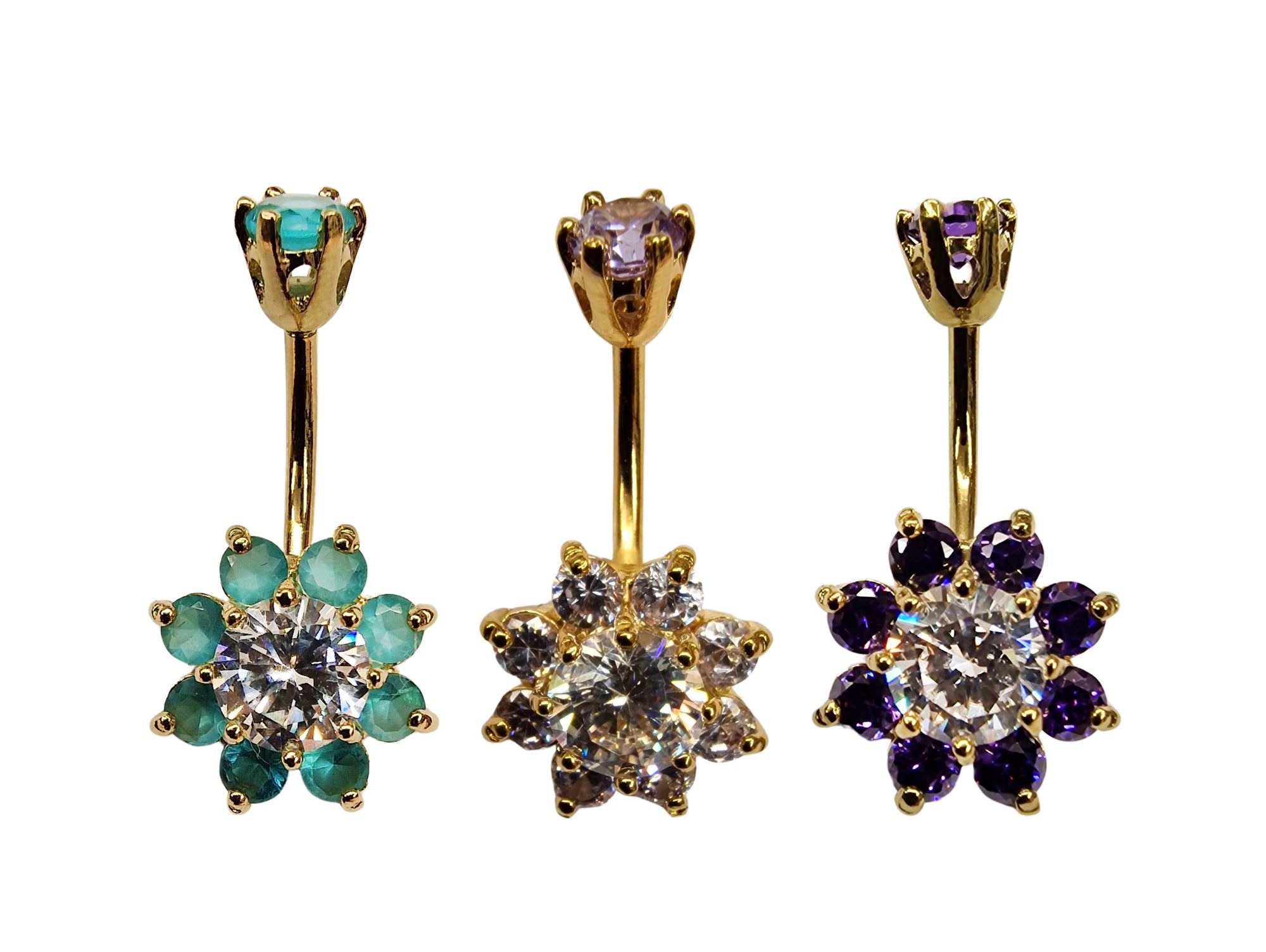 Sun Flower Belly Button Ring, Navel Ring - Silver Gold Plated Belly Bar Crystal Body Jewellery - 14G - Length is 10mm