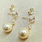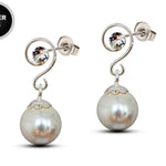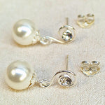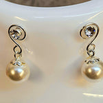 Silver Drop Dangle Pearl Earrings Spiral Design with Crystal adding a touch of sparkle to the intricate design