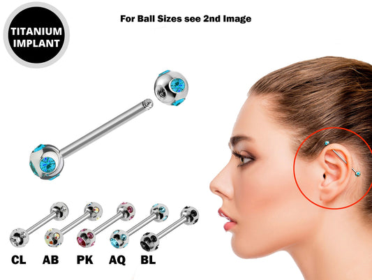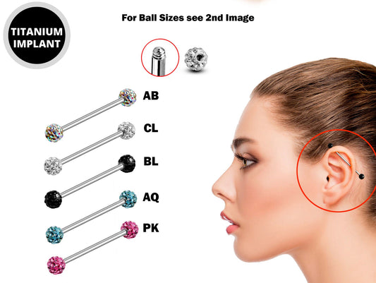 Titanium Industrial Barbell Piercing for Upper Cartilage Earrings with Multi Stone Crystal Ball - 16g 14g Long Barbell