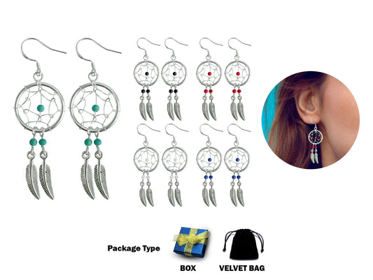 Silver Dreamcatcher Feather Dangle Drop Earrings - Native American Amulet Protection with Genuine Stone Beads