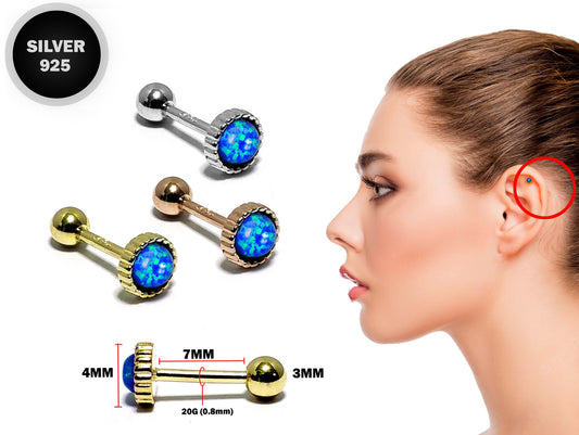 Silver Helix Bar, Cartilage Piercing, Helix Earring - 20G Ear Piercing with Blue Opal Stone - Helix Piercing Jewellery