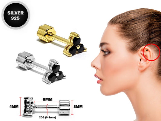 Silver Cartilage Flower Earring, Helix Earring with CZ Jet Black - 20G Ear Piercing Screw Back- Helix Piercing Jewellery