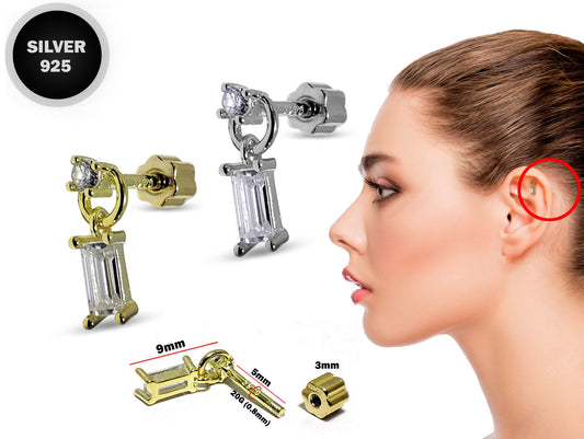 Silver Dangle Cartilage Earring, Upper Helix Bar Piercing with CZ Crystals - 20G Ear Piercing Screw Back- Helix Piercing Jewellery