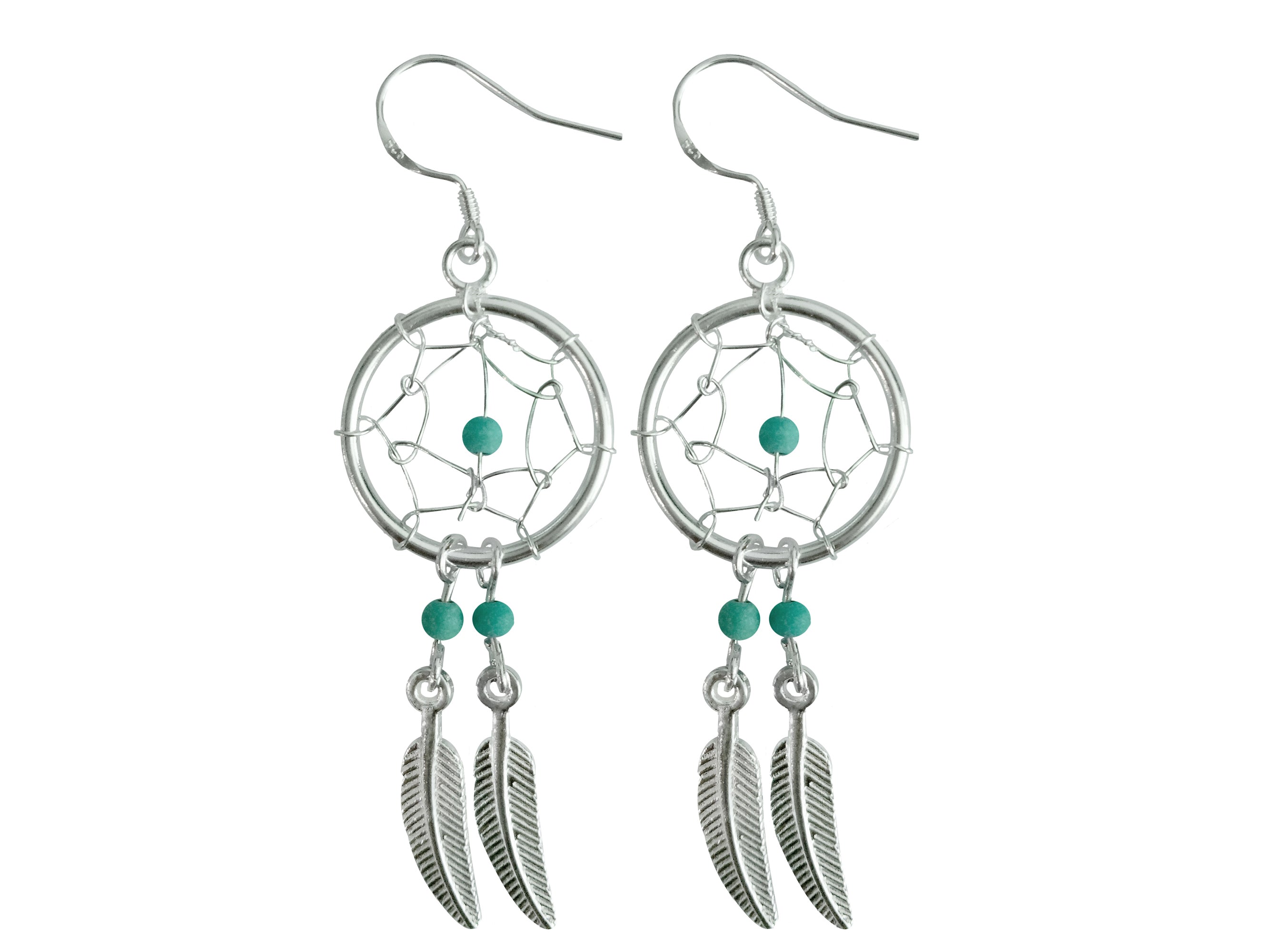 Silver Dreamcatcher Feather Dangle Drop Earrings - Native American Amulet Protection with Genuine Stone Beads