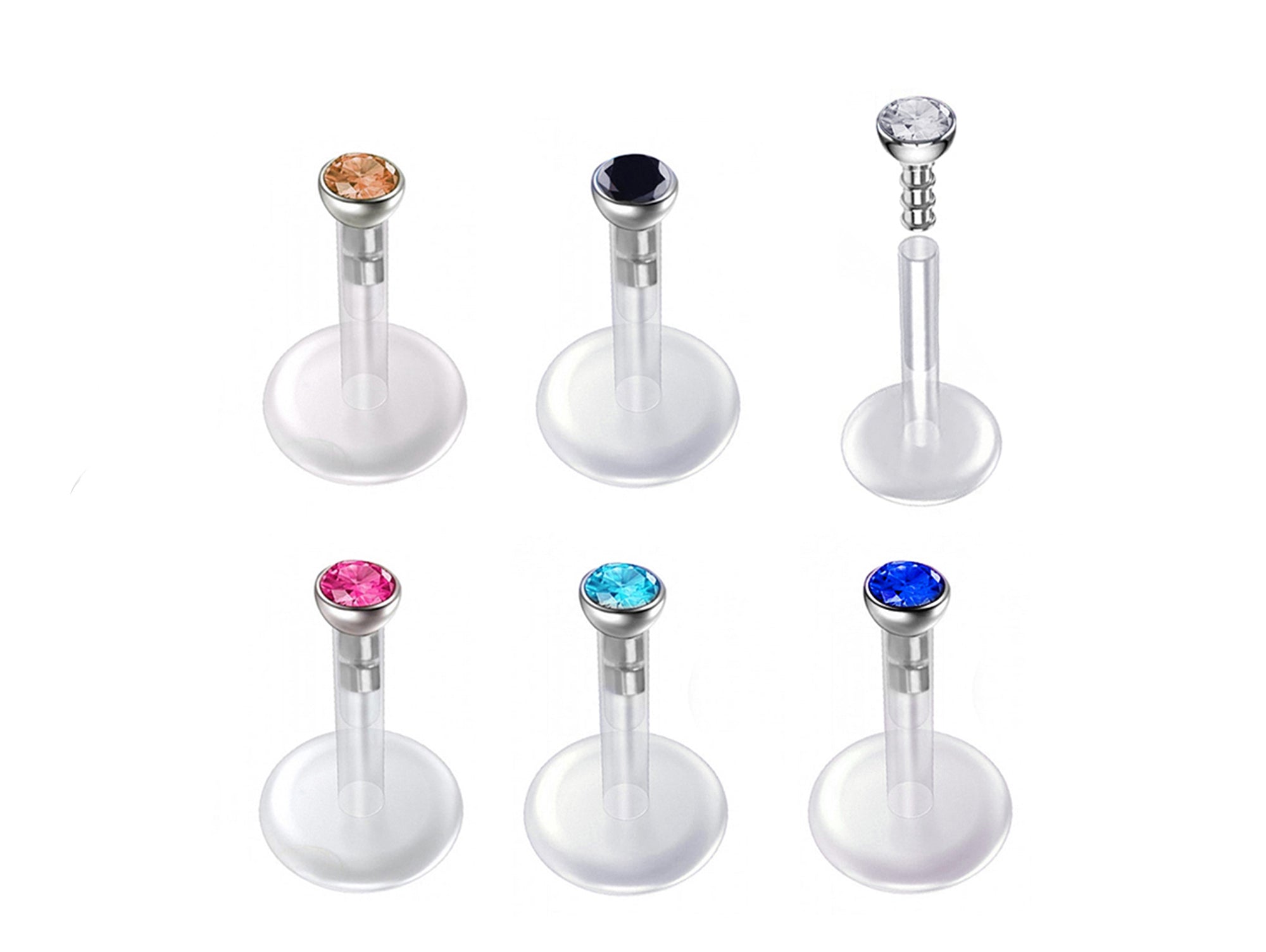Flexible Labret Retainer - 6 pieces - 16G Labret with Top Gem CZ Crystals - Bioplast Labret - Hide Piercing Lip Labret - Clear Transparent