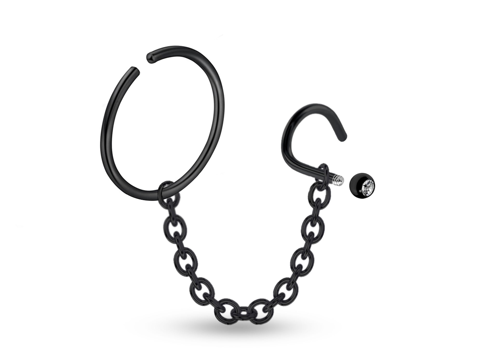 Black Nose Chain Jewelry - Nose Screw Stud with Crystal and Segment Ring Hinged with Chain Sets - Nose Combination Piercing 18G to 20G