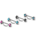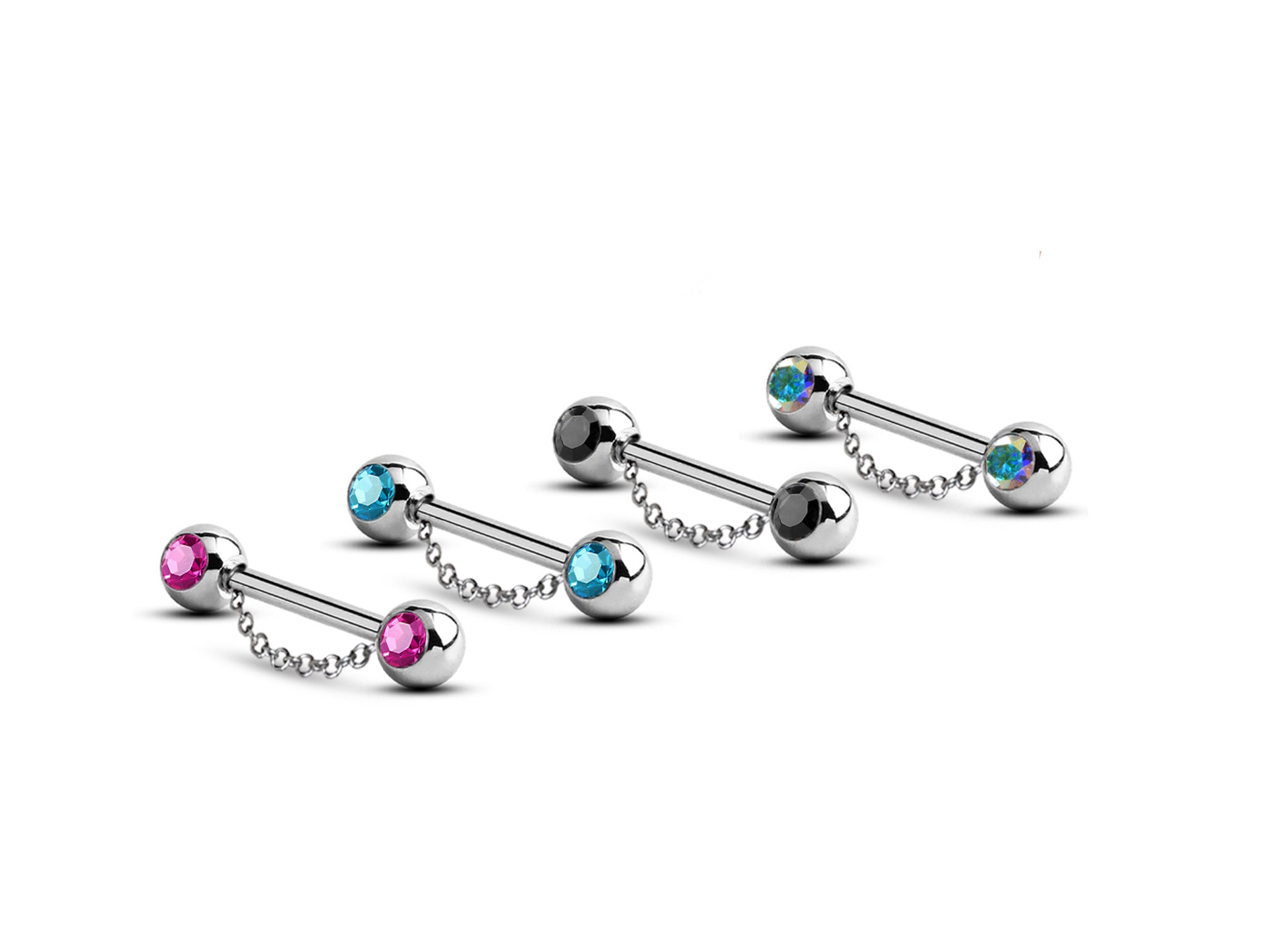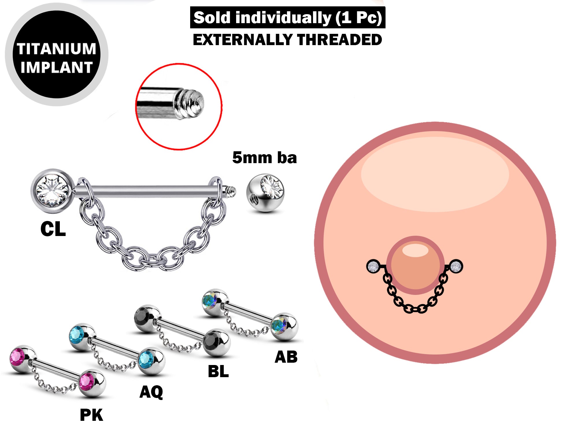 Nipple Barbell Front Gem CZ Crystal with Piercing Chain - Titanium Nipple Jewelry Studs 16g 14g Nipple Shield - Externally Threaded