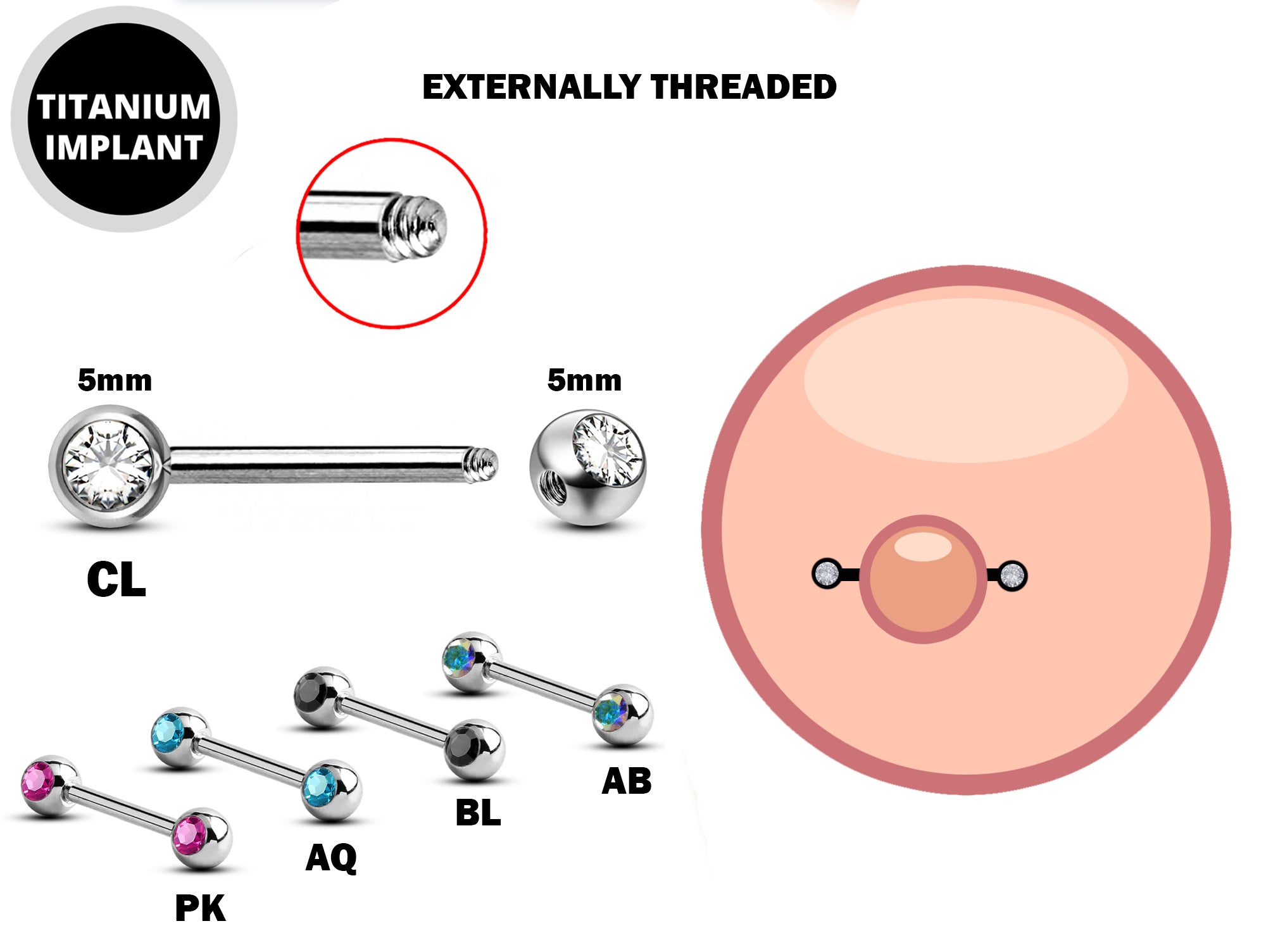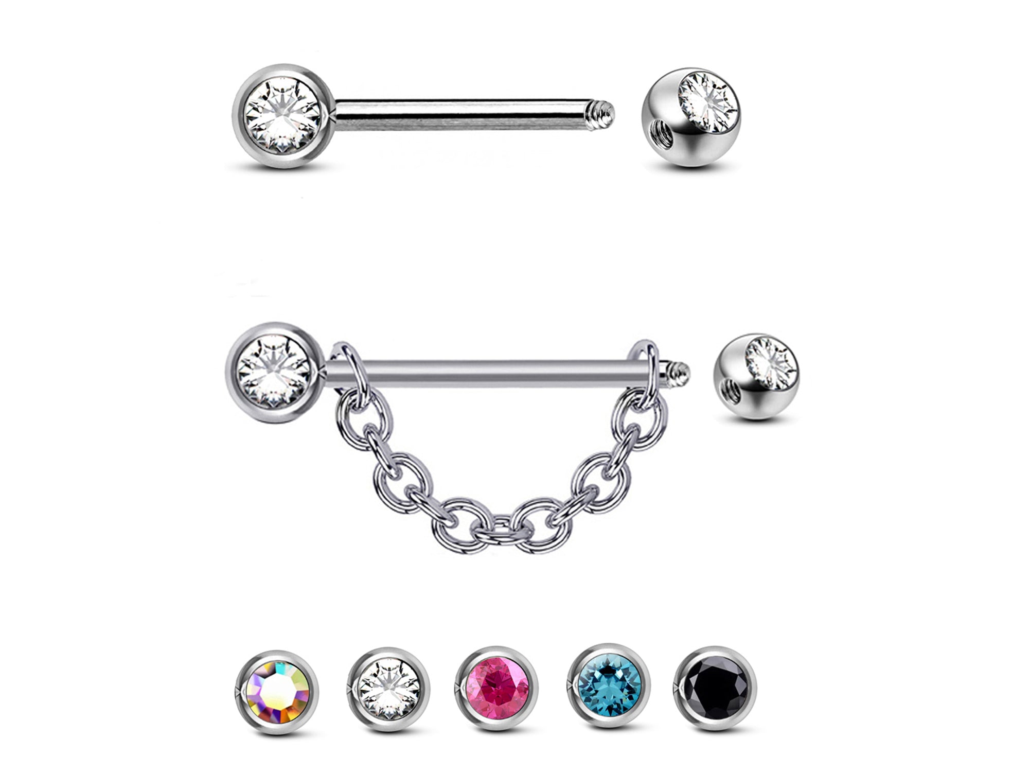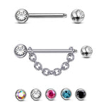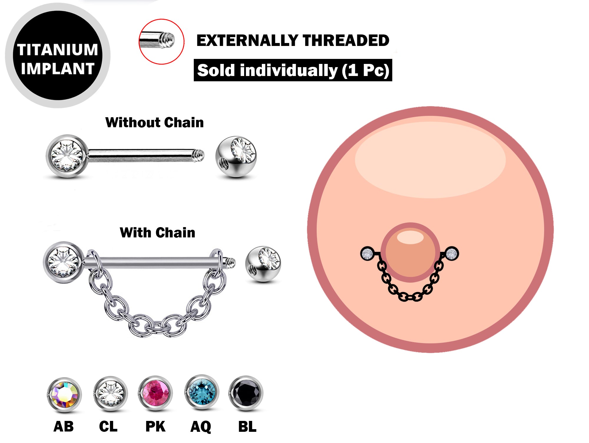 Titanium Nipple Barbell Front Gem CZ Crystal, Nipple Jewelry Studs 16g 14g Nipple Piercing - Externally Threaded - with Chain or No Chain
