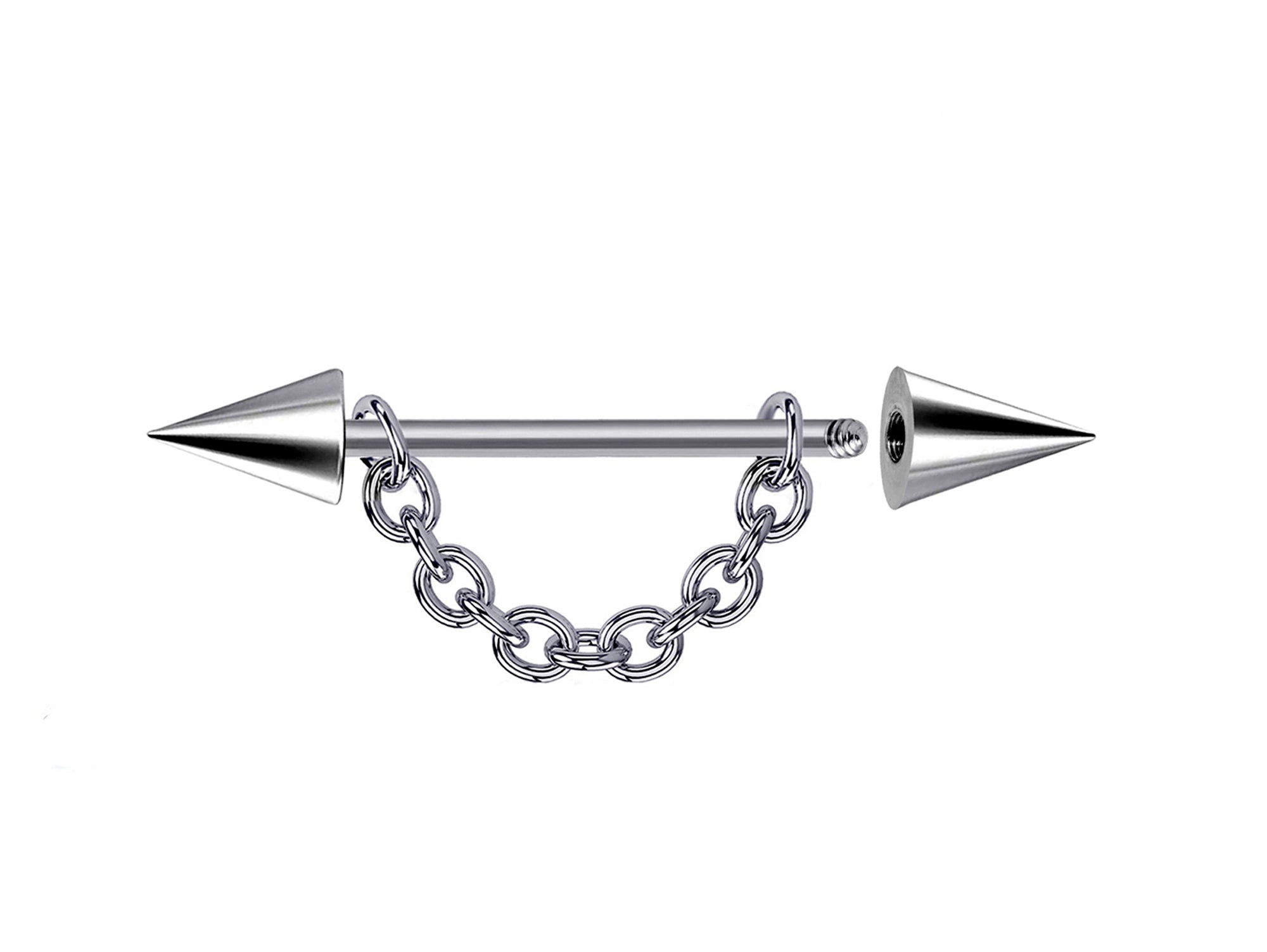 Cone / Spike Nose Bridge Barbell Upper Nose Piercing with Steel Chain - 16G 14G Straight Barbell - Choose Spike and Cone Size