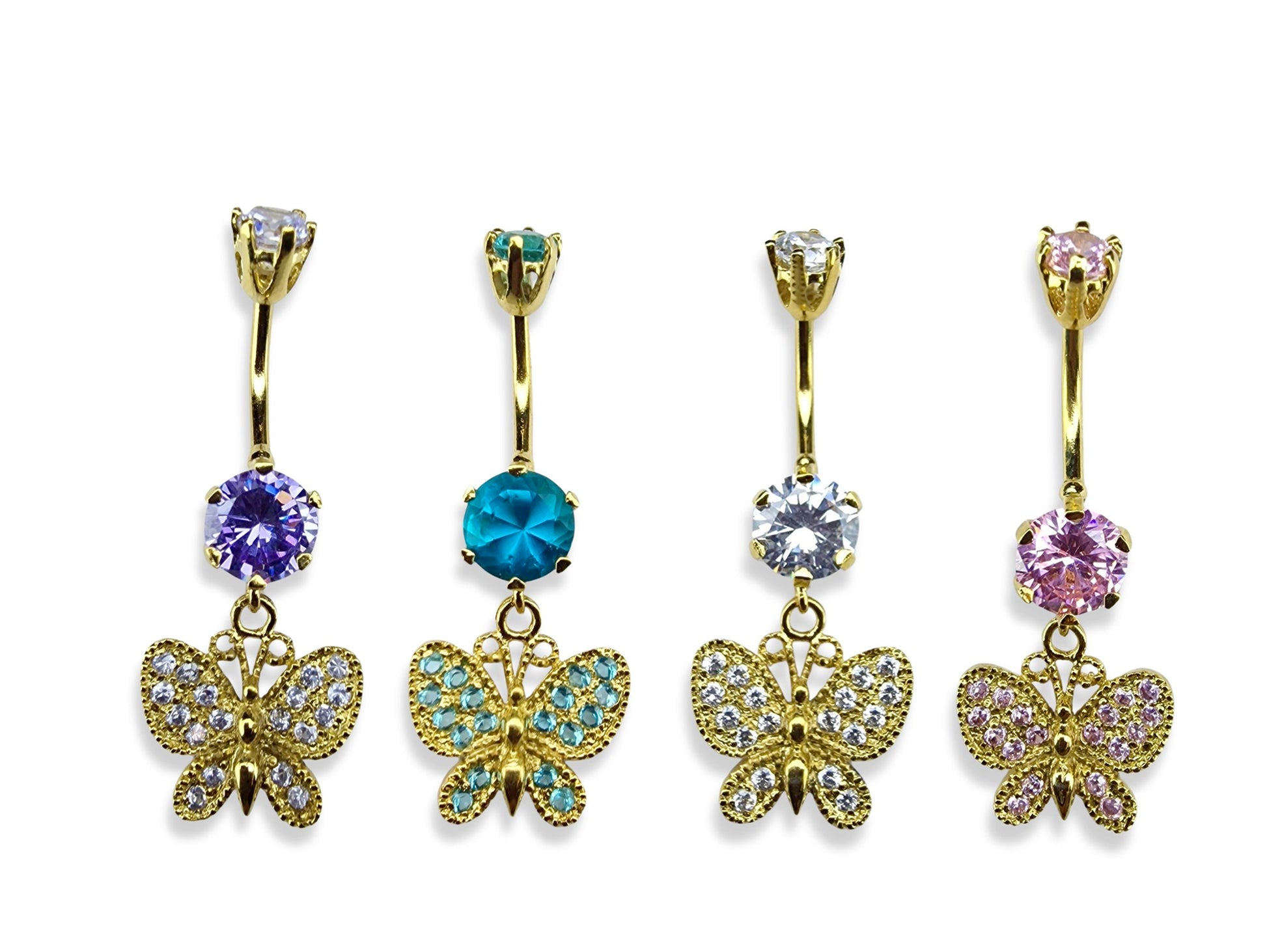 Belly Piercing, Belly Ring - Gold Plated Butterfly Dangle Belly Bar studded with CZ Crystals - 14G length is 10mm