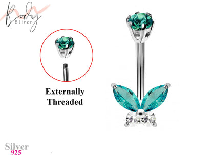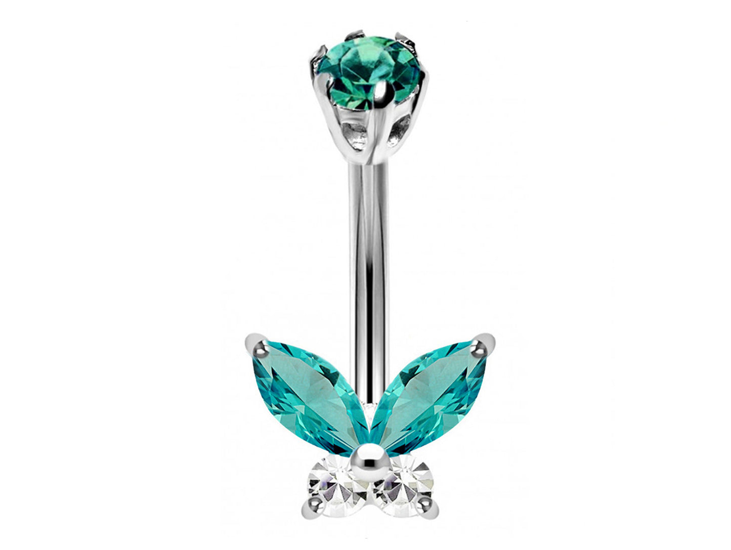 Silver Butterfly Belly Button Ring, Belly Bars- Navel Ring with High Quality Crystals - 14g (1.6mm) Length is 10mm